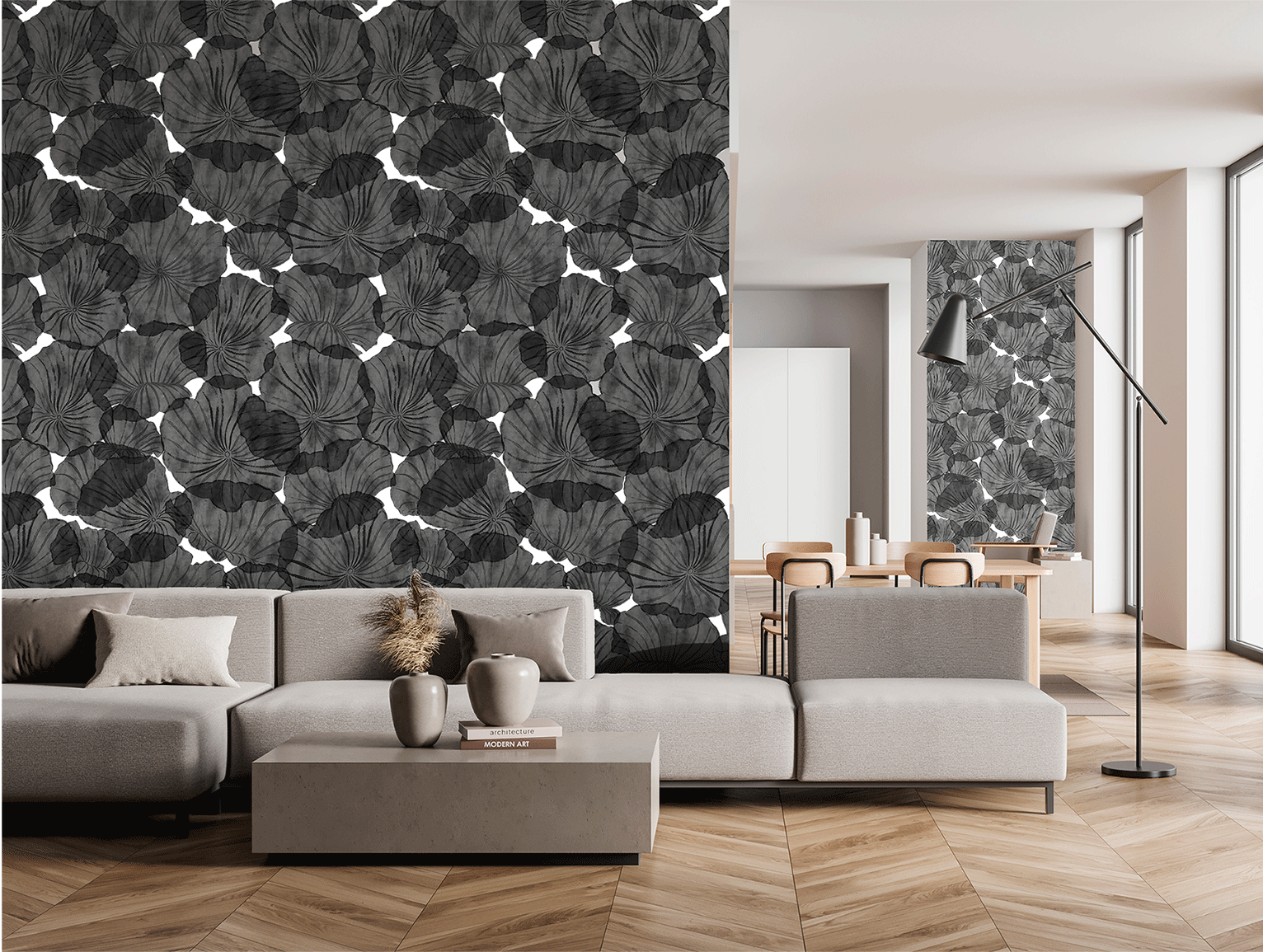 Flores opacas flotan desde el techo hacia la pared creando una sensación etérea y moderna...PRODUCTO BAJO PEDIDO*