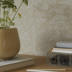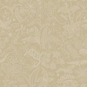 Un clásico querido el papel pintado Grazia, con un fondo amarillo apagado y un patrón beige claro, representa flores y hojas suaves y fluidas con caras que miran a través del follaje. Al recordar la diversión y la libertad de un jardín de verano sueco, agrega un encanto cálido y brillante al espacio circundante.