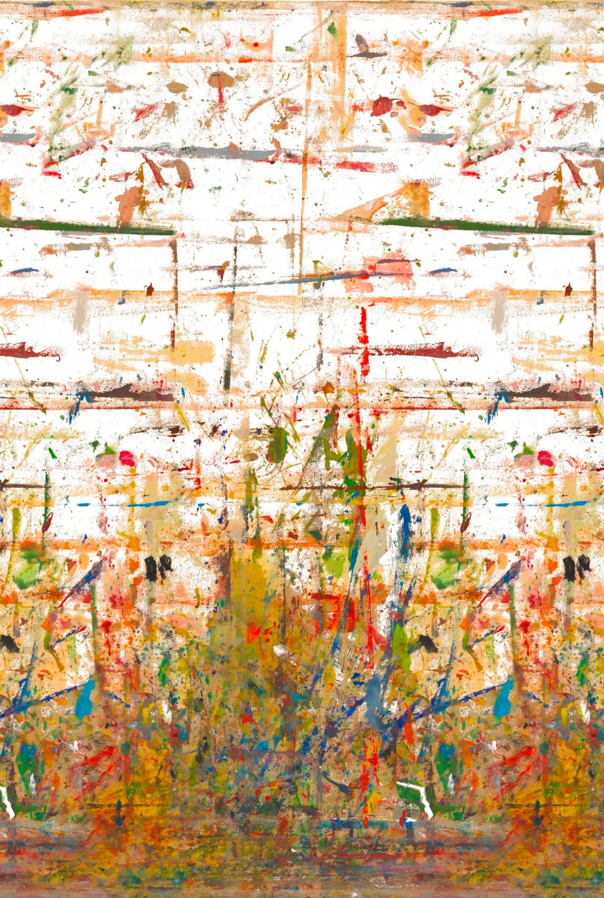 El diseño refleja su proceso creativo sobre papel, reinterpretado en un motivo panorámico con efecto 3D sobre base textil laminada.